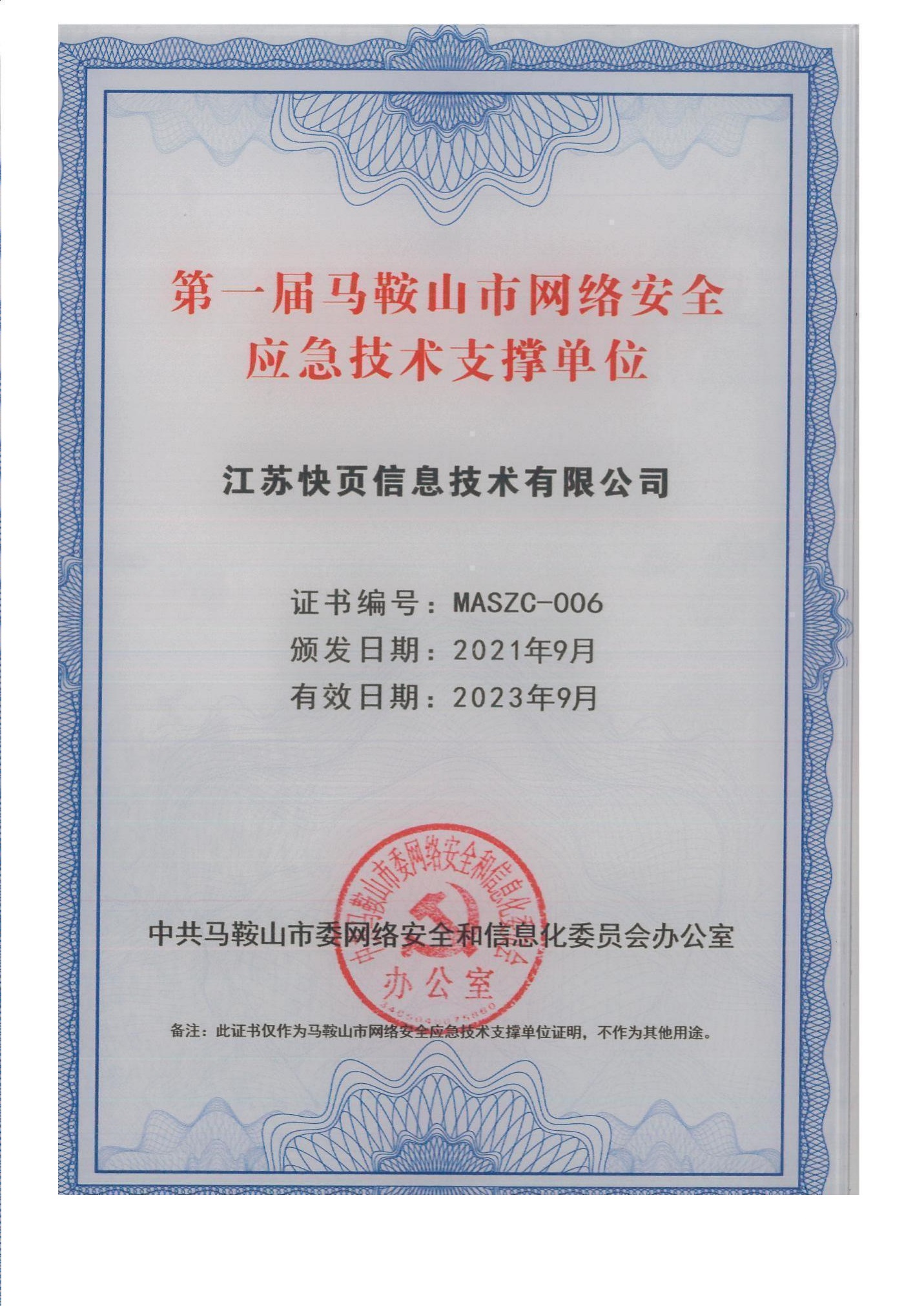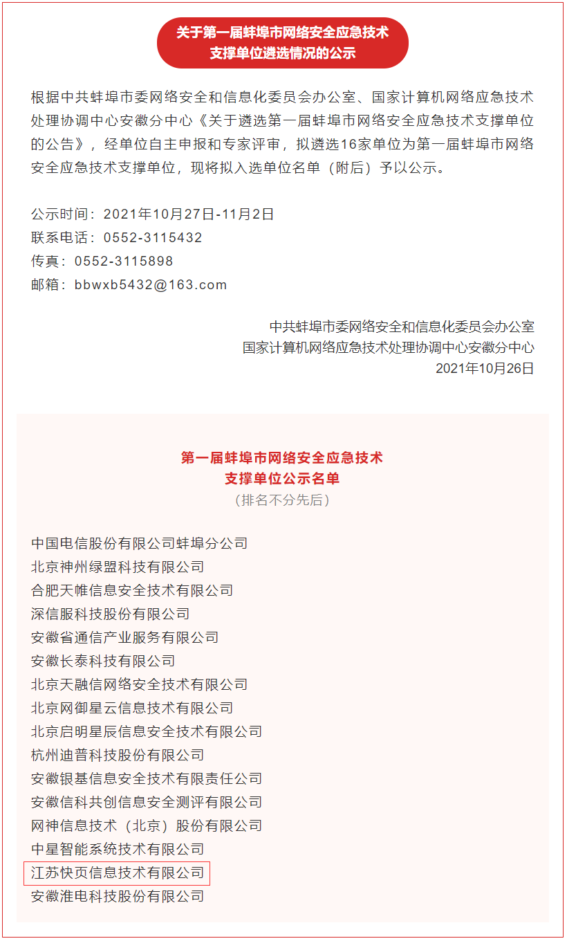 快页入选蚌埠市网络安全应急技术支撑单位 近日,中共蚌埠市委网络安全和信息化委员会办公室、国家计算机网络应急技术处理协调中心安徽分中心发布第一届蚌埠市网络安全应急技术支撑单位拟入选单位,江苏快页信息技术有限公司(以下简称“快页”)经自主申报、资料审查、专家评审等环节,成为第一届蚌埠市网络安全应急技术支撑单位。 此次入选蚌埠市网络安全应急技术... 阅读全文 > 2023/02/02